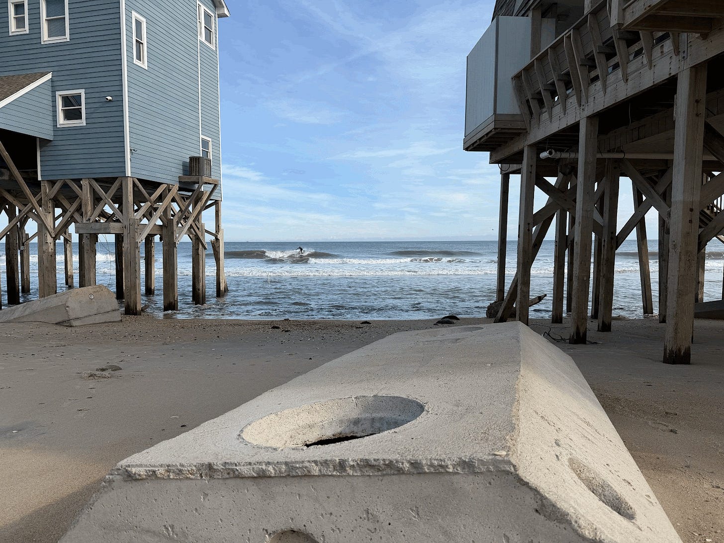 The state has a vested interest in keeping the Outer Banks accessible and economically viable. Dare County is considered a donor county, meaning that it generates substantial sales tax, largely from tourists, that fund essential services, like emergency management, beach nourishment or dredging. These funds effectively contribute to the state’s overall budget, which can include coastal infrastructure. But as properties collapse or lose value, fewer homes remain available for vacationers and debris from fallen structures increasingly threatens the safety and cleanliness of public beaches – like those surfers I saw on my walk, who seemed unperturbed by the waste nearby. Over time, the loss of land and housing threatens both the local tax base and the daily lives of community members.